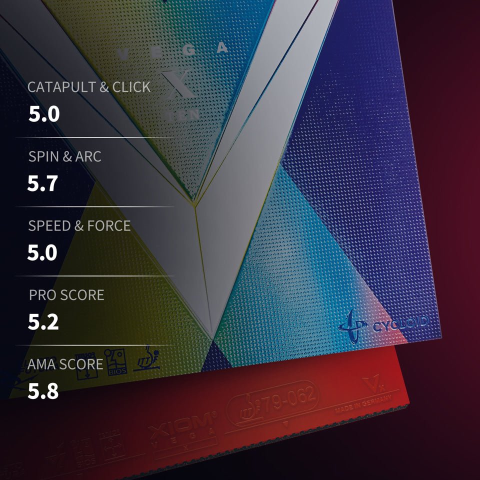 Fața de paletă tenis de masă XIOM Vega X este un cauciuc topspin de ultimă generație, fiind una dintre cele mai bune opțiuni pentru generarea unui spin puternic combinat cu viteza și controlul adaptate mingii de plastic. Are o spumă mediu-tare de 47,5° și un strat superior (topsheet) cu aderență ridicată și elasticitate sporită datorită tehnologiei Dynamic Friction inspirată de anvelopele pentru zăpadă.